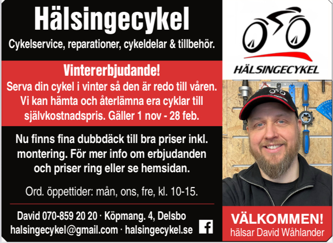 24/3-26: Inlämningsstopp för cykelservice/reparation. Då det redan är fullt i verkstan. Ring eller smsa för att bli uppsatt på väntelistan.